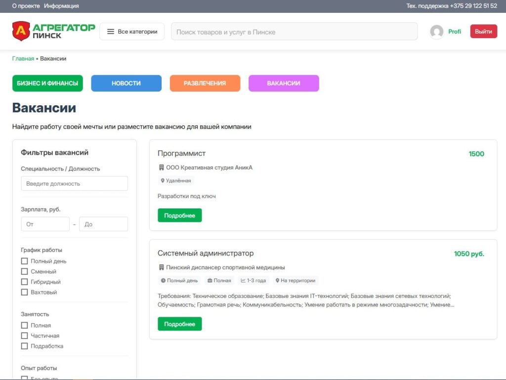 Удобный поиск вакансий, по должности, по зарплате и другим фильтрам.